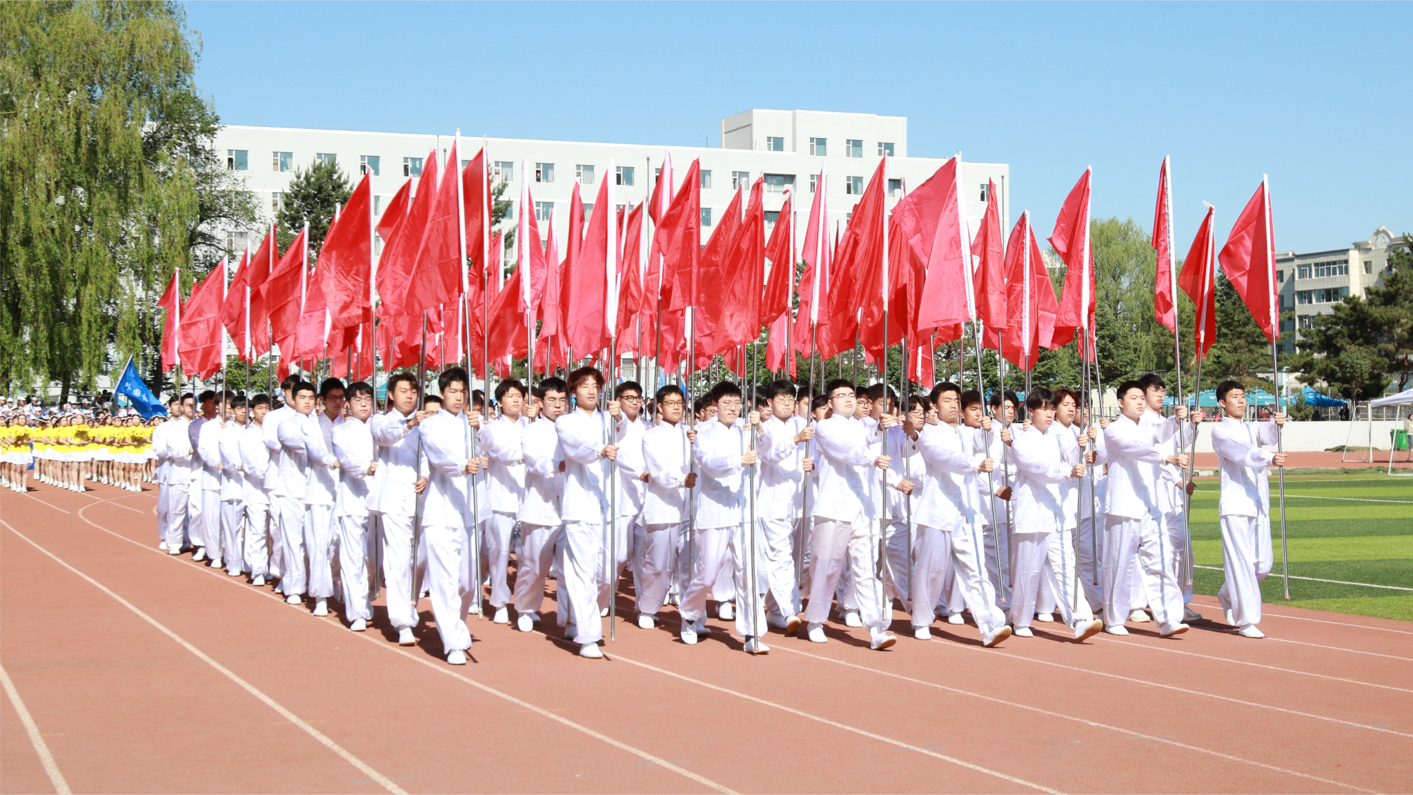 8:00,伴隨著激昂的《運動員進行曲》,來自全校各單位的18支檢閱隊伍邁著矯健的步伐走過主席臺,步履鏗鏘、旗幟高揚,展示學科特色、激揚青春風采,以飽滿的熱情彰顯新時代學子拼搏向上的斗志和決心。