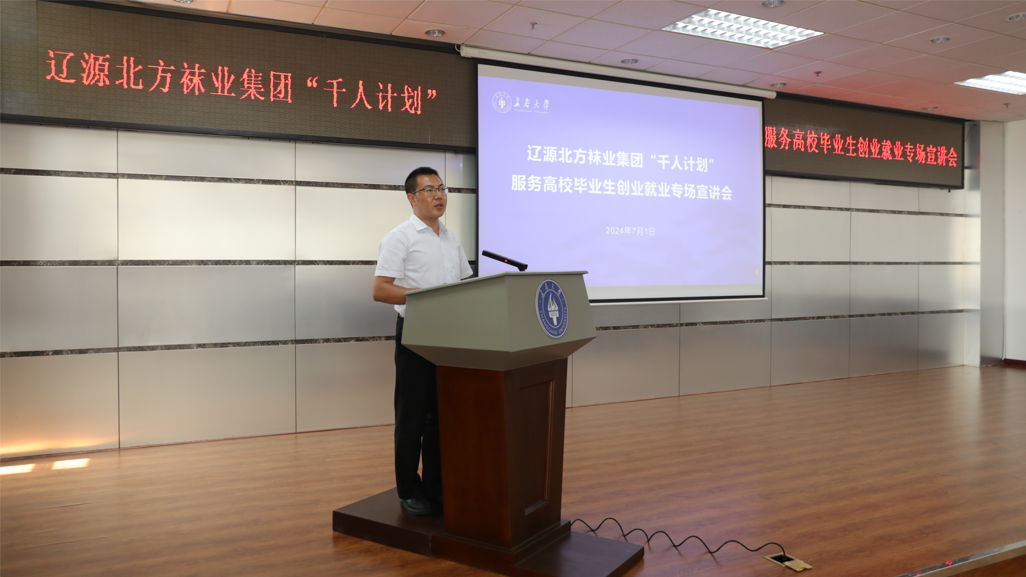 為了使“吉林省大學生‘走進遼源 創業就業’雙選實踐活動”走深走實,落地見效,7月1日,遼源北方襪業集團“千人計劃”服務高校畢業生創業就業專場宣講會在我校舉行。遼源市教育局專職總督學陳立波、人社局副局長于慶豐,北方襪業集團人力資源部部長姜浩出席宣講會,宣講會由學校就業創業指導中心主任李貴海主持。
