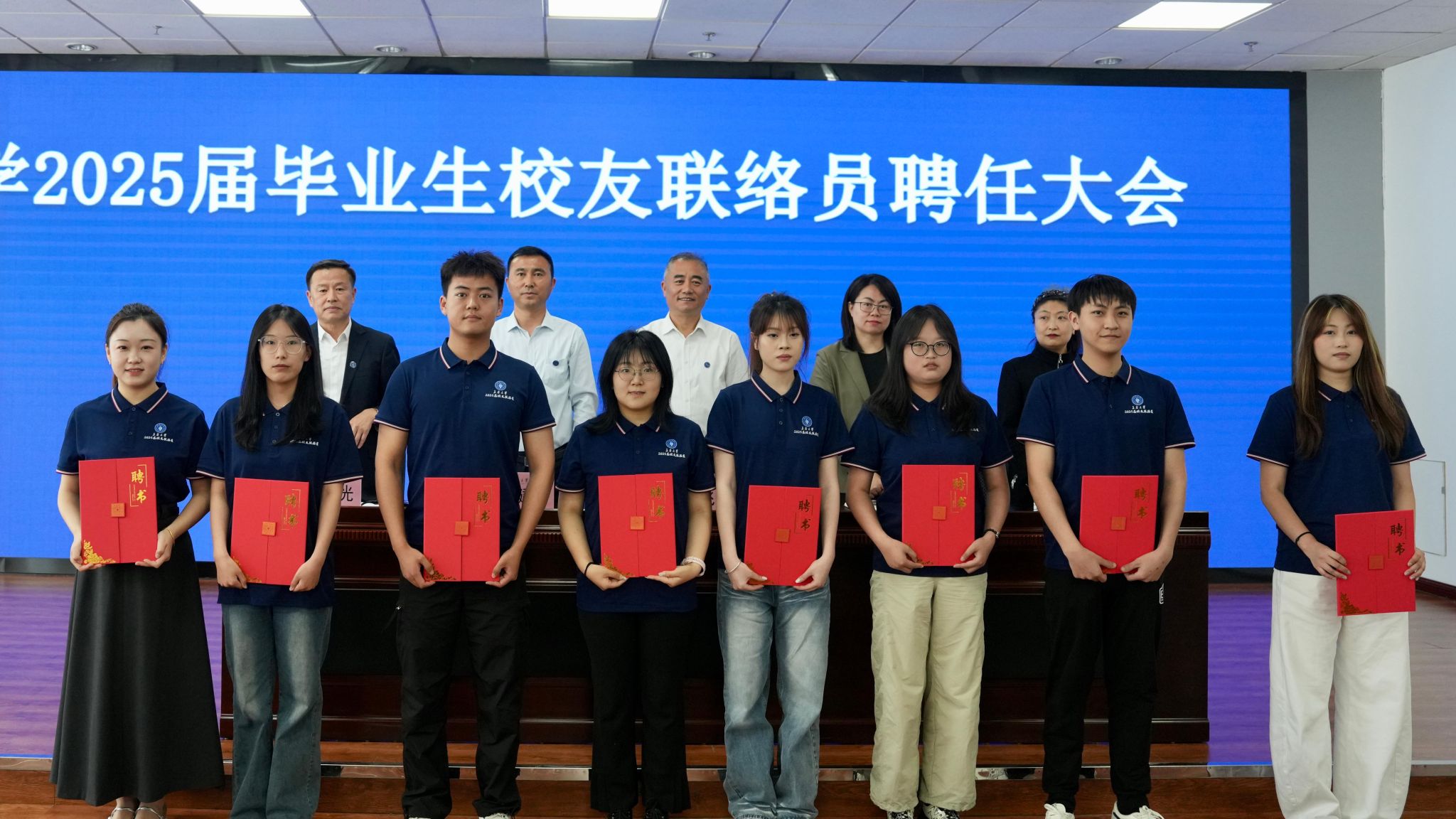 與會領(lǐng)導和高春光為2025屆畢業(yè)生校友聯(lián)絡(luò)員代表頒發(fā)聘書。